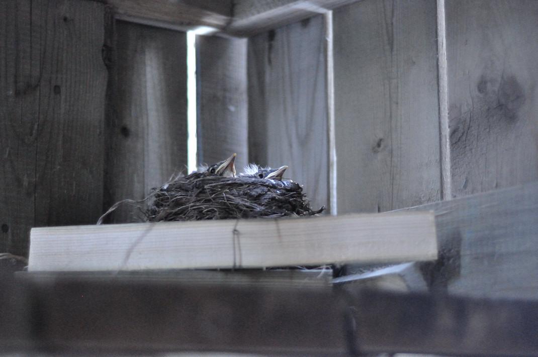 У нас под патио птицы свили гнездо. Во время ремонта гнездо упало на землю почти с двухметровой высоты. Птенцы были совсем голенькие, горячие и совершенно беспомощные. Здесь они через пять дней после падения и переноса гнезда в другой угол надстройки. Им уже места в гнезде мало! Немного фотографий