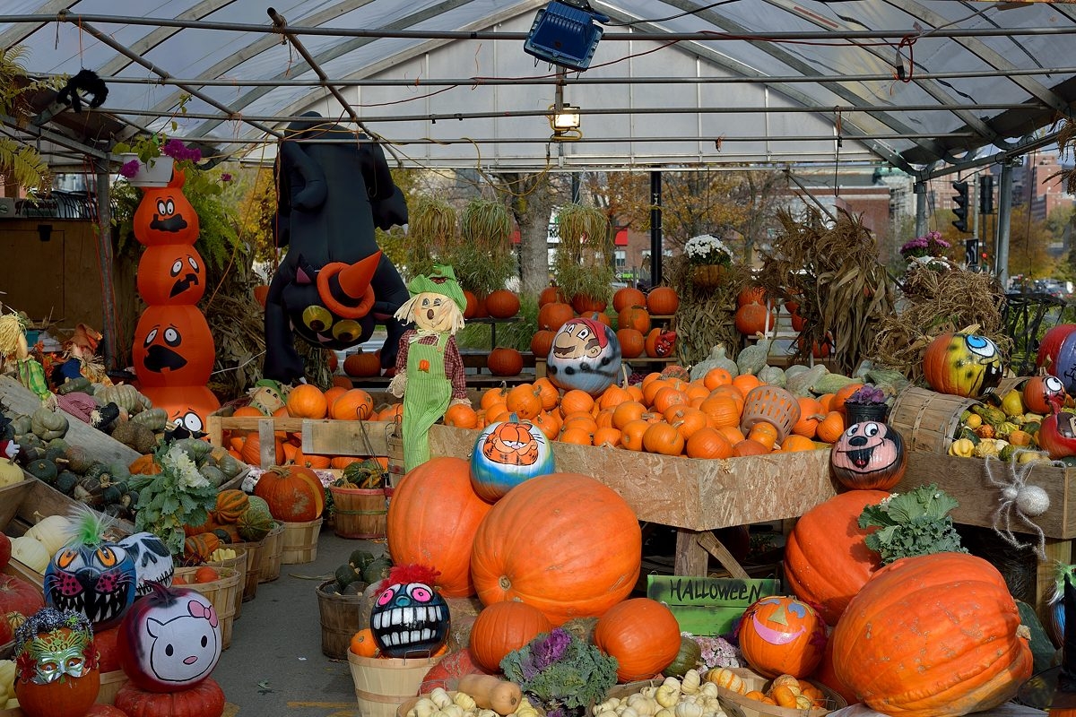 Здесь продаются только тыквы. Большие, маленькие, рыжие, белые, любые. Но только тыквы. Atwater Market, Montreal, канал Lachine. Есть тыквы с прорезями. Можно купить такую подготовленную тыкву и поставить вовнутрь свечку или сунуть фонарик. Будет страшно! 31-ого вечером - Halloween.