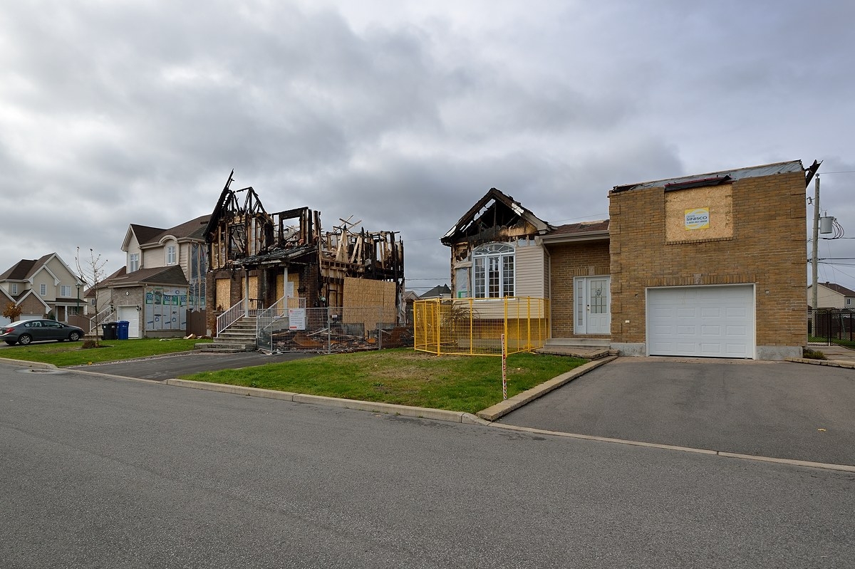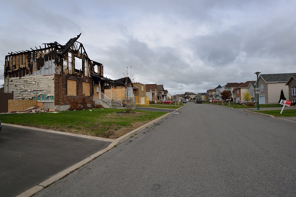 Слева дом как после бомбёжки, сгорел. Обычная улица канадских новостроек, пригород Монреаля - Vaudreuil-Dorion, rue Crocus. Это один из немногих районов, где недвижимость даже сейчас во время полного застоя всё ещё продаётся и покупается. Ещё один оживлённый район на рынке недвижимости - Châteauguay.