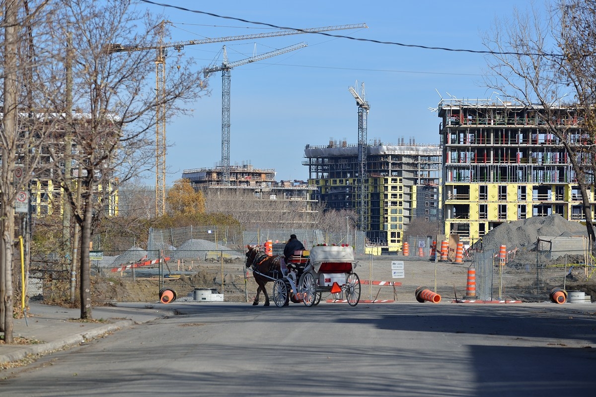Это наш строящийся Гриффинтаун - район в центре Монреаля. В Griffintown находятся конюшни монреальского гужевого транспорта. В наши дни лошади катают детей и туристов, в центре города экипаж можно использовать как такси, а можно заказать и карету на свадьбу.