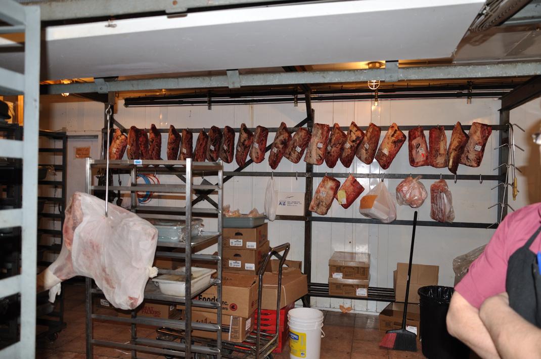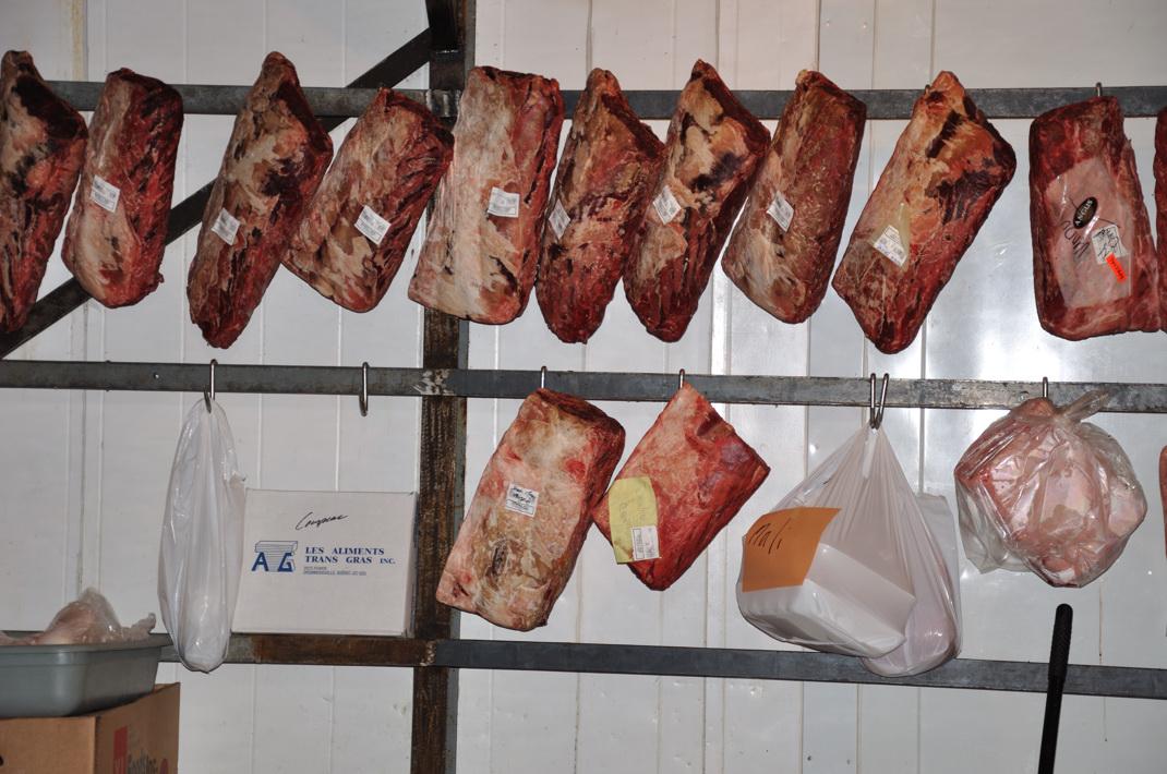 Оказывается, мясо у них из Альберты, потому что в Альберте оно лучшее. Я спросил у владельца, как его сюда доставляют, видимо замороженным. Нет, мясо не морозят, доставляют охлаждённым в вакуумной упаковке. Это такой плотный запаянный полиэтиленовый мешок, в нём как будто в растворе болтается большой кусок мяса. Мешок вскрывают, мясо подвешивают на крюки, после этого оно идёт на расфасовку.