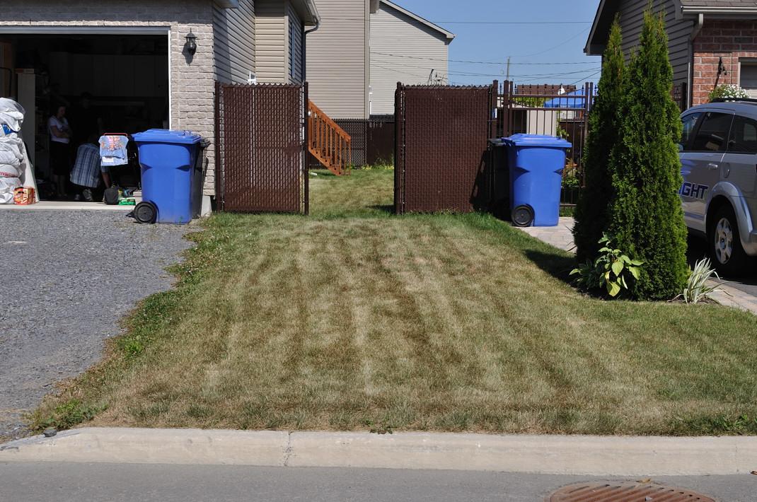 Траву у дома нужно поливать, стричь, подсеивать, протыкать землю специальной тыкалкой или вилами, чтобы через дырки почва дышала, ну и подкармливать травку тоже нужно. Здесь газон после 2-3 недель жары и отсутствия дождей. Поливать тоже нужно по правилам - день недели, время, час, и ещё нужно знать, разрешено ли поливать автоматической поливалкой. Если что не так - штраф.