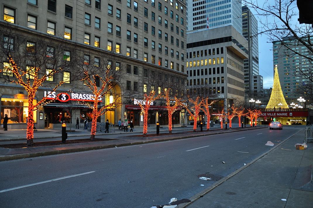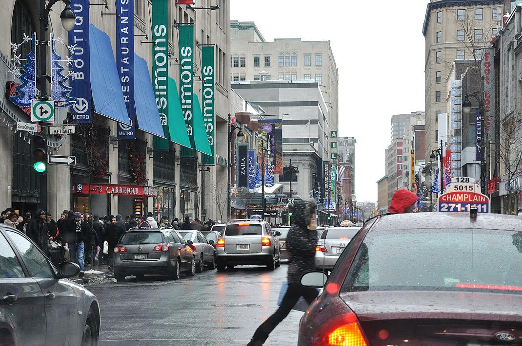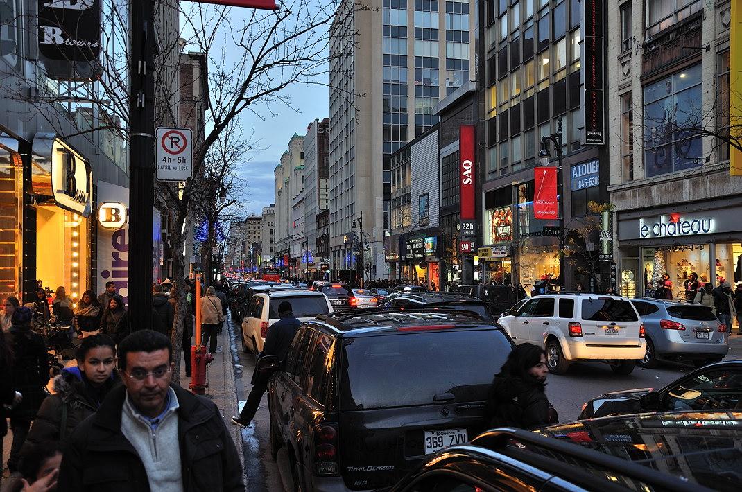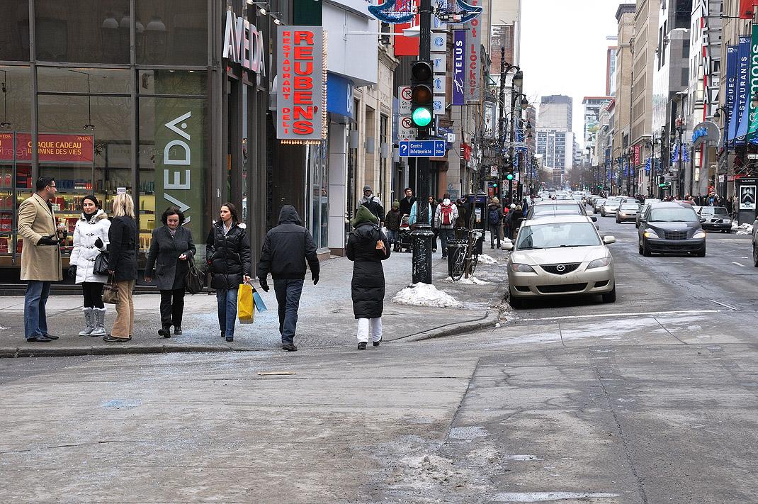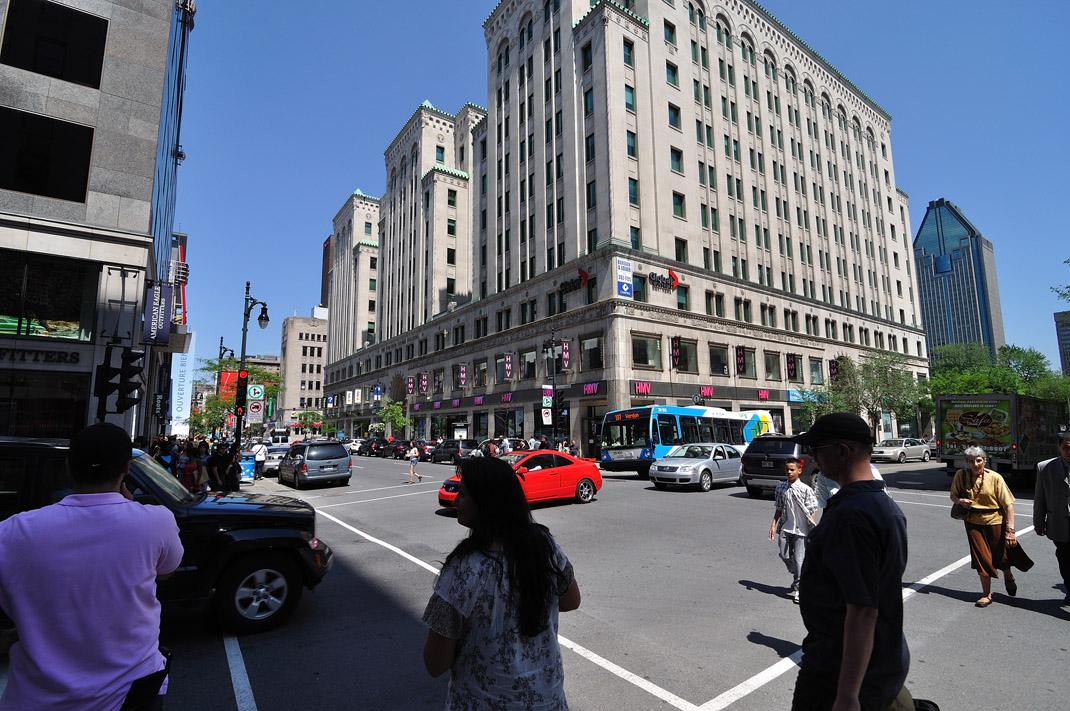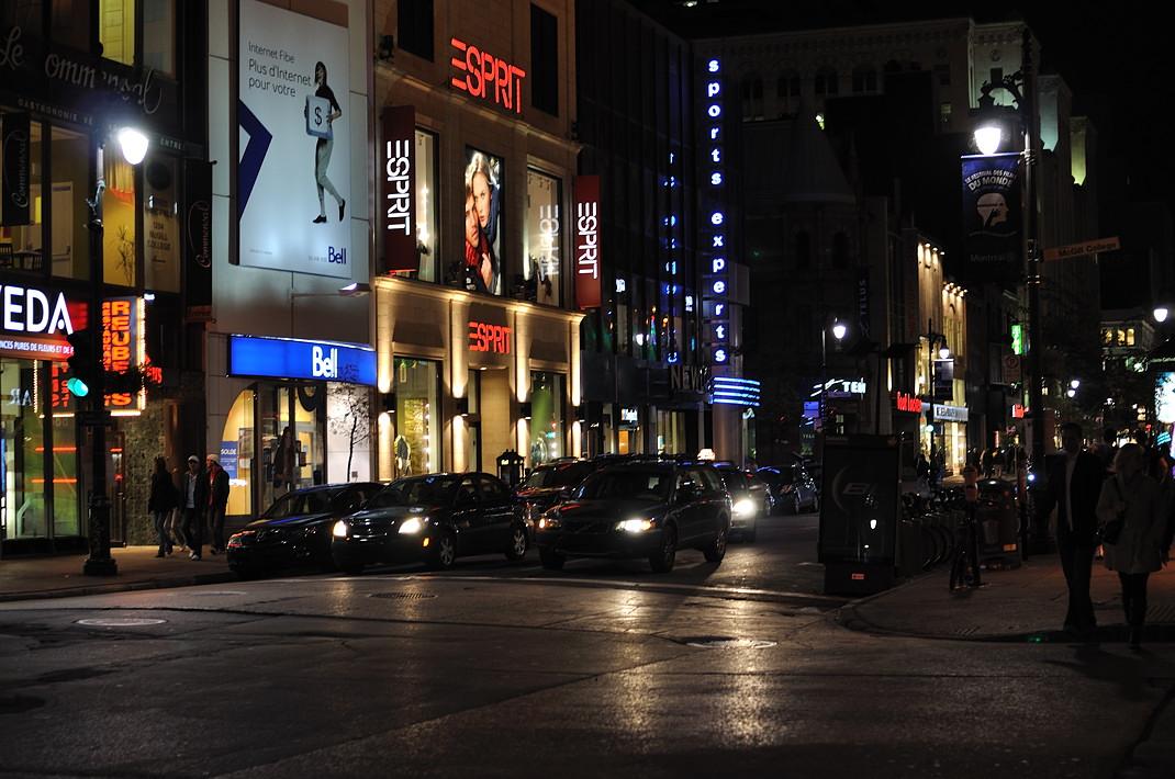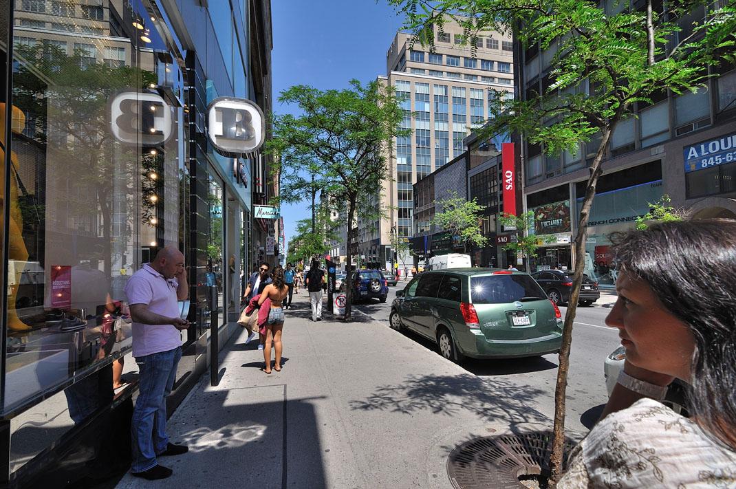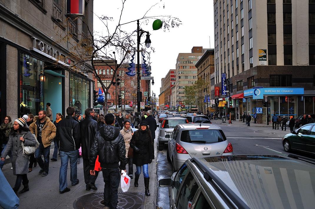 Днём перекрёсток с Crescent отдыхает, набирается сил, открывает-закрывает двери бар лучшего в городе пива Les 3 Brasseurs, это время шоппинга и туристов. Отсюда до самого La Baie – красивого торгового центра с парфюмерно-косметическим изобилием на первом этаже и не самым удачным товаром на остальных этажах – Сан-Катрин – это 100% торговая улица, где можно найти и купить абсолютно всё. Конечно, главное – одежда. Любая. Самая дорогая и самая дешёвая – всё есть, на любой вкус. Здесь хорошо днём, много людей, и всегда что-то происходит. Какие-то «спэшиалы», промоушены, рекламы и просто распродажи.