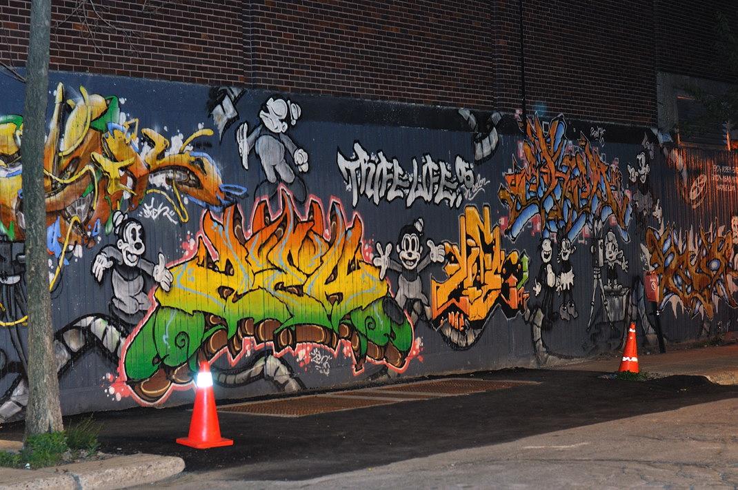 Сразу за Place des Arts наша Сан-Катрин снова меняется. На углу с Saint Laurent появляется много кафе и прохожих немного странного вида. Разрисованные стены, украшения, здесь собираются то ли сатанисты, то ли байкеры. Там же неподалёку очереди на дискотеки причём из вполне приличных современных молодых людей. Всё живёт своей жизнью. Человеку приезжему здесь явно будет неуютно, но ради любопытства можно заглянуть и сюда. Вечером, конечно. Эта часть Сан-Катрин наполнена молодёжью, часть из них - студенты университета UQAM, здесь есть довольно известный театр, и в общем ничего страшного и криминального в этом месте нет, хотя мысли такие у вас тут точно будут.