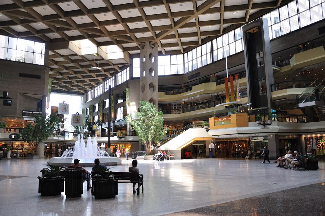 После La Baie дальше на восток улица становится чуть менее интересной, пока вы не дойдёте до Place des Arts. На Площади искусств находится большое и очень красивое внутри здание - Complexe Desjardins. В центре фонтан, кругом магазины, рестораны, а выше, над всей этой красотой целый этаж занимает и свысока на нас смотрит наша налоговая - Revenu Quebec.