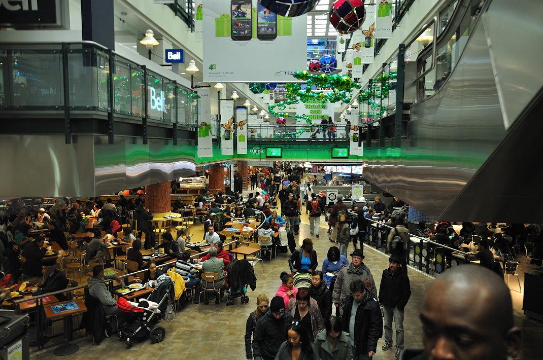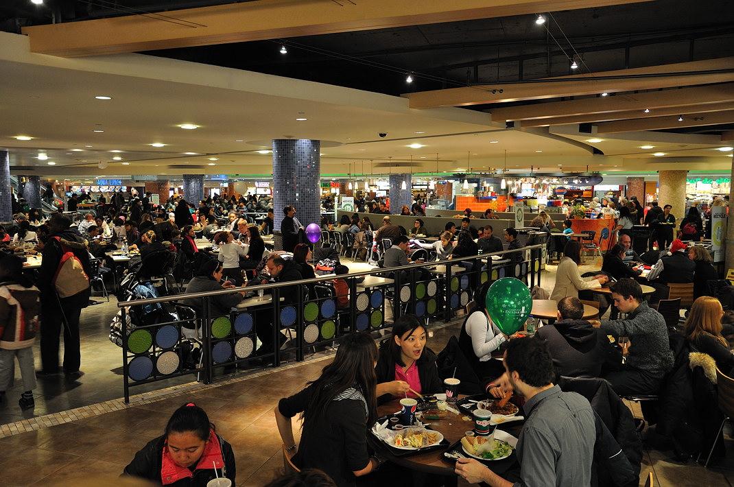 Без того, чтобы "поесть" у нас никуда. Целый этаж выделен для этого. Вдоль стен точки общепита, в центре столики. Это только один торговый центр на Saint-Catherine, а сколько их там?