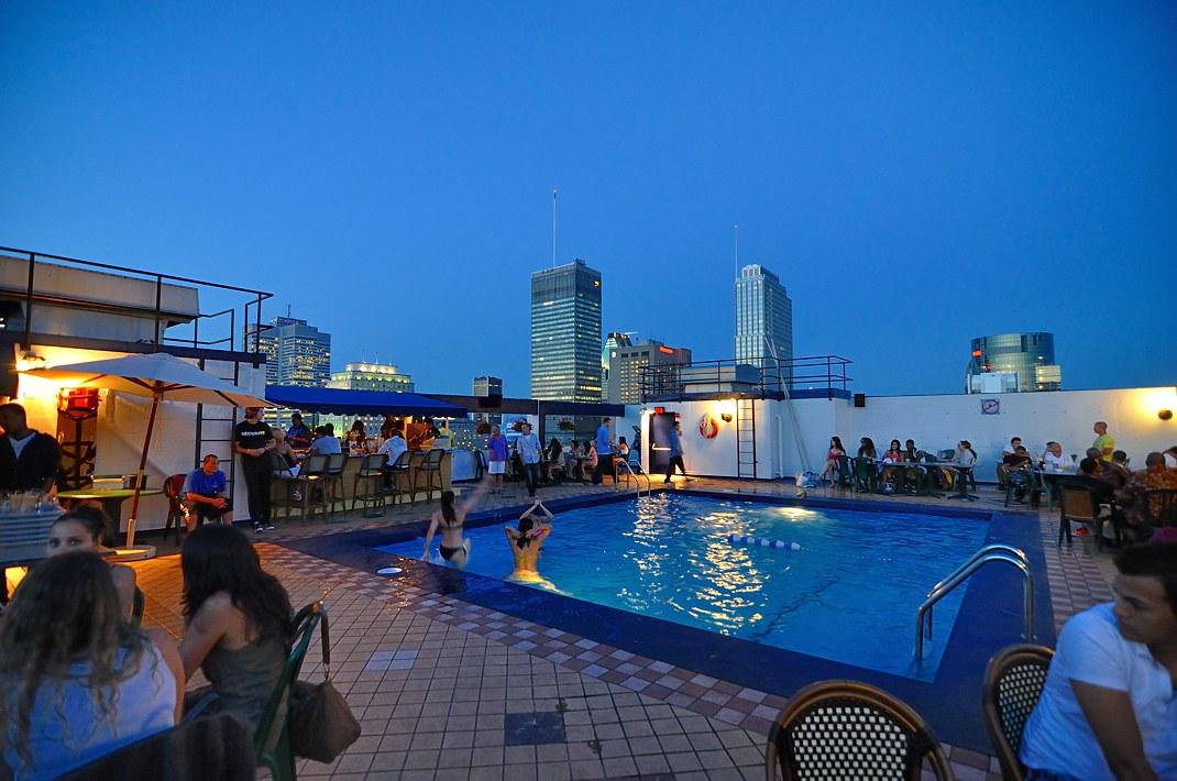 И раз уж вы пришли сюда летом, то вам нужно зайти в Hotel de la Montagne, подняться на 20-ый этаж и оказаться на знаменитой террасе. Это бар на крыше, над вами ночь, вокруг светящийся город и небоскрёбы, чуть выше бара на той же крыше – толпа и голубой бассейн. Кругом смех, музыка, веселье, тёплый южный ветер, девушки в купальниках, очень тесно, много молодых людей, и вы не сразу поймёте, вы ли это, и где вы.