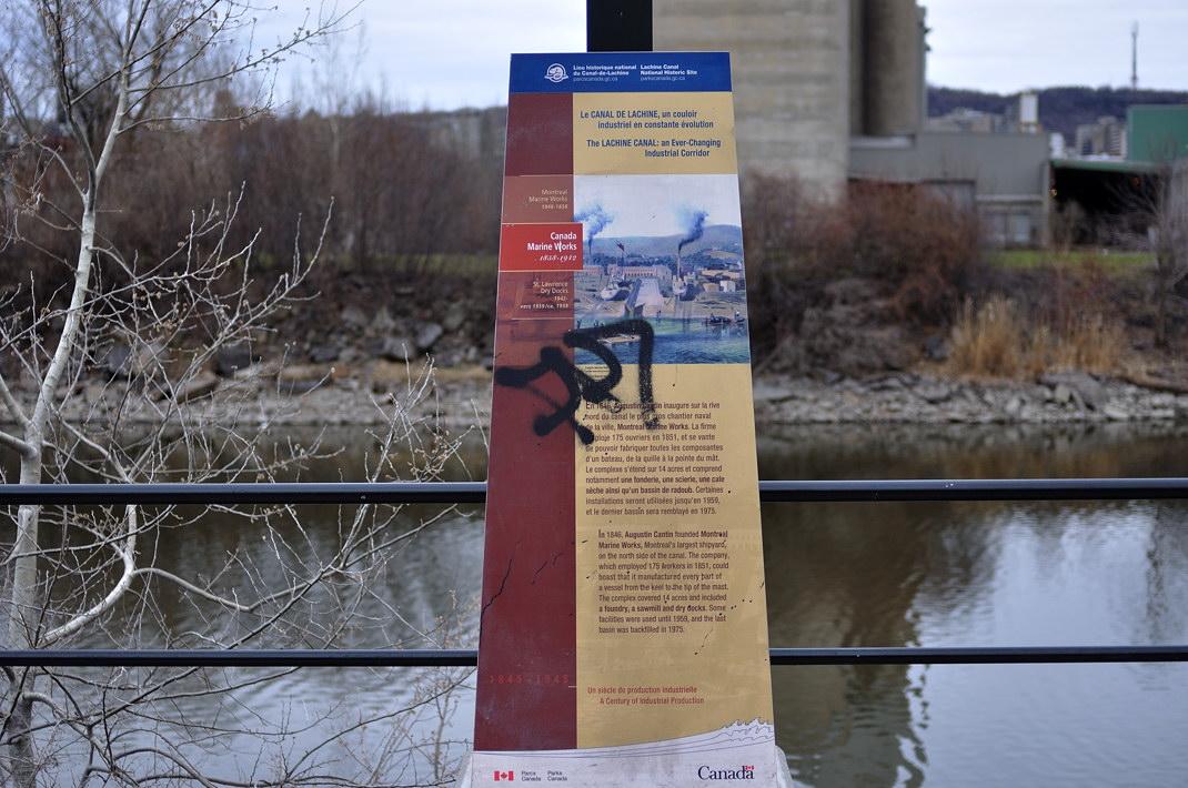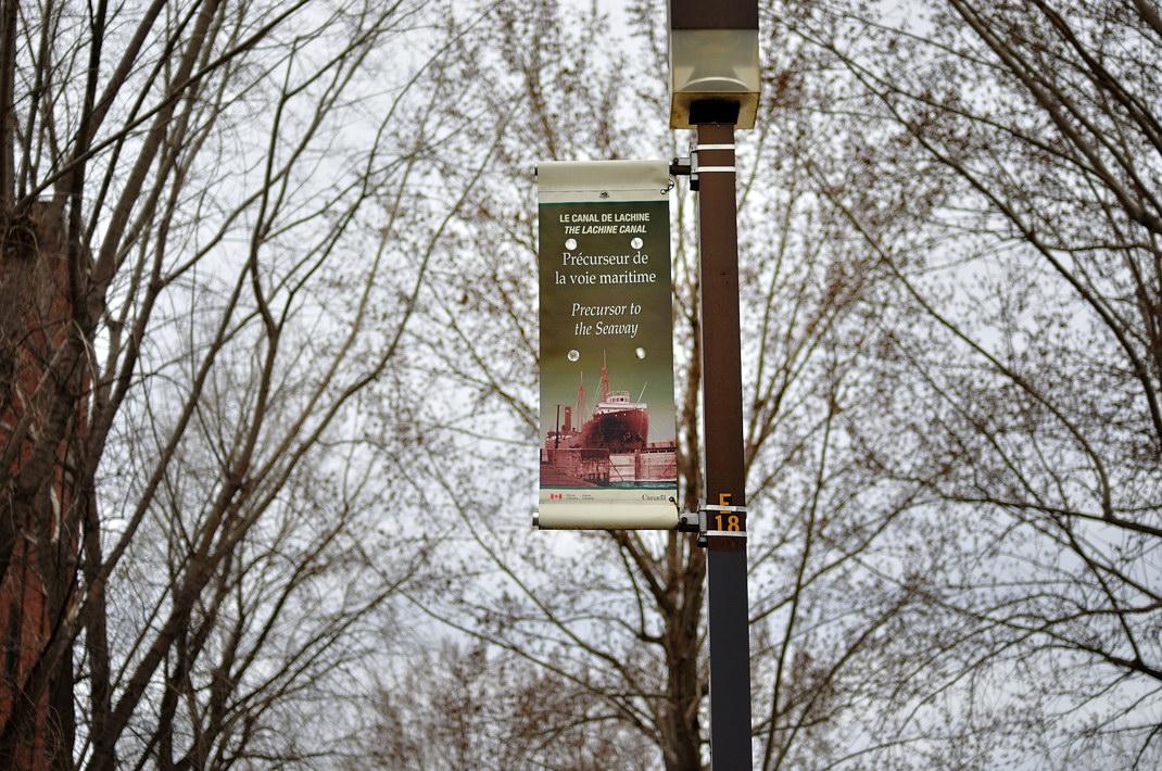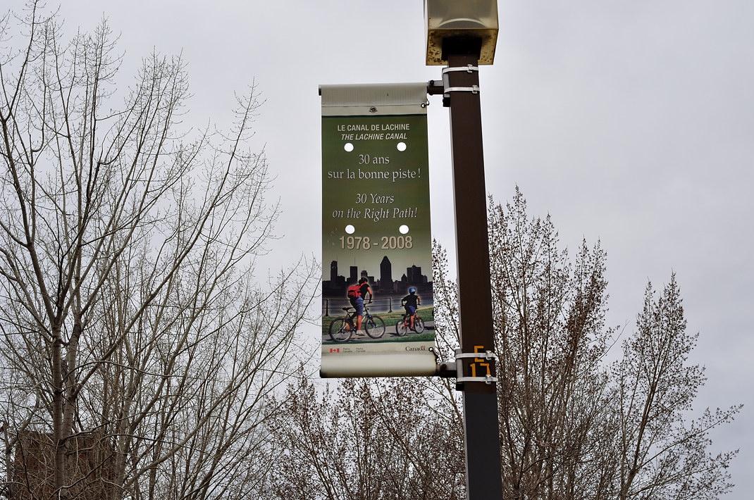 Что тут хотели сказать авторы этого баннера от Parc Canada - для меня загадка. Я не знаю, что значит эта дата 1978 год (Формально в этом году канал Lachine был передан в управление Parc Canada). В 1999 году, когда я поселился на Pointe Saint-Charles, на канале пахло тиной и болотом, никаких дорожек здесь не было, не было и этих баннеров на столбах. Вот так всегда и везде записывается история. Кстати, надпись на баннере на английском сделана не в соответствии с законами о французском языке в Квебеке. Английский шрифт по размеру должен быть в два раза меньше французского. В конце 90-ых такого бы не допустили.