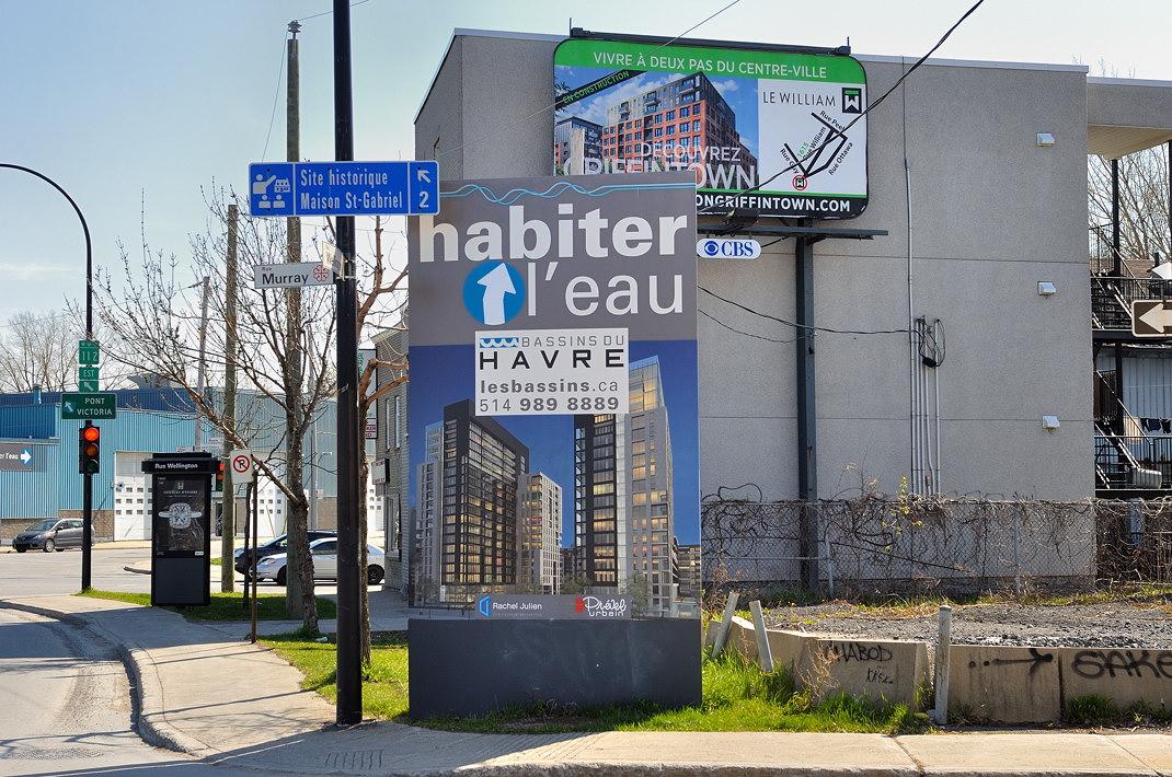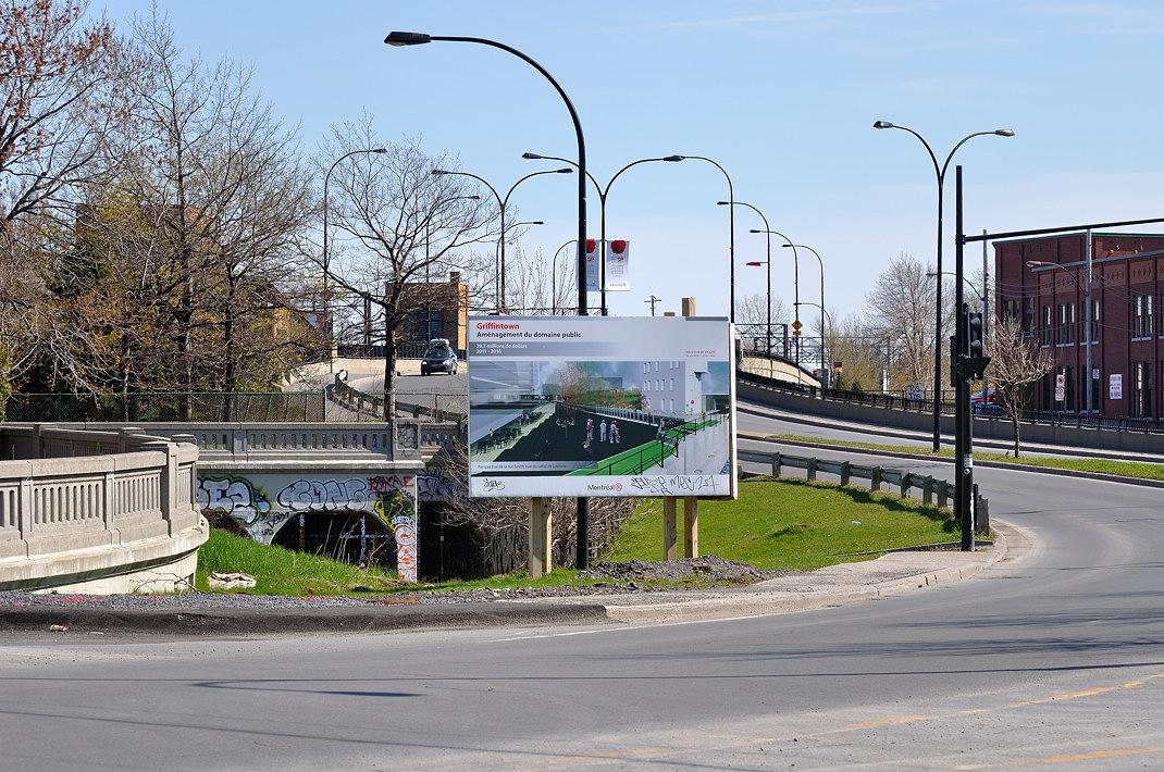 Муниципалитет поставил свой рекламный плакат Griffintown - чтобы все знали, что скоро здесь будет город-сад. Мостик через канал Лашин. За мостиком – Pointe Saint-Charles. Перед мостиком, там где плакат – Griffintown.