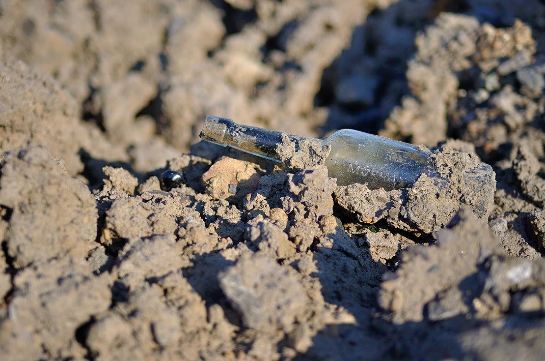 Старая бутылка начала прошлого или позапрошлого века. Она была в верхнем слое земли, которую сгребли в кучу. Дождь, прошедший за день-два до моего появления, смыл с бутылочки всю грязь, и она вот так преспокойно лежала на поверхности. Горлышко у неё было забито чем-то чёрным, как будто смолой. Внутри была какая-то жидкость. Забирать такую непонятную ценность с непонятным содержимым из индустриального района позапрошлого века мне не хотелось. Бутылочка так и осталась лежать на этом месте. Она явно не из-под пива. Чуток маловата для этого. Граммов на 200.