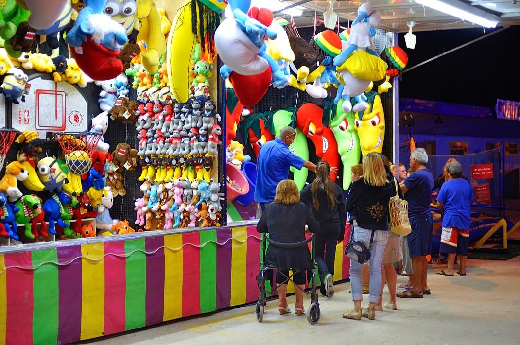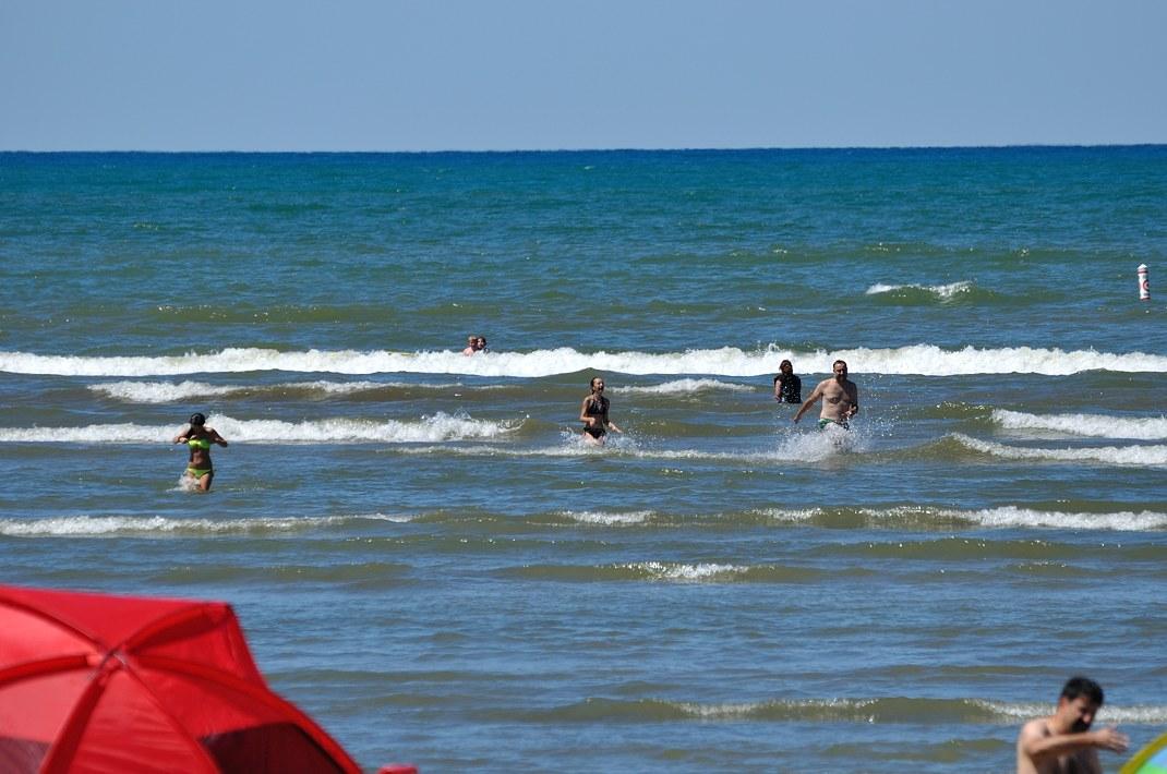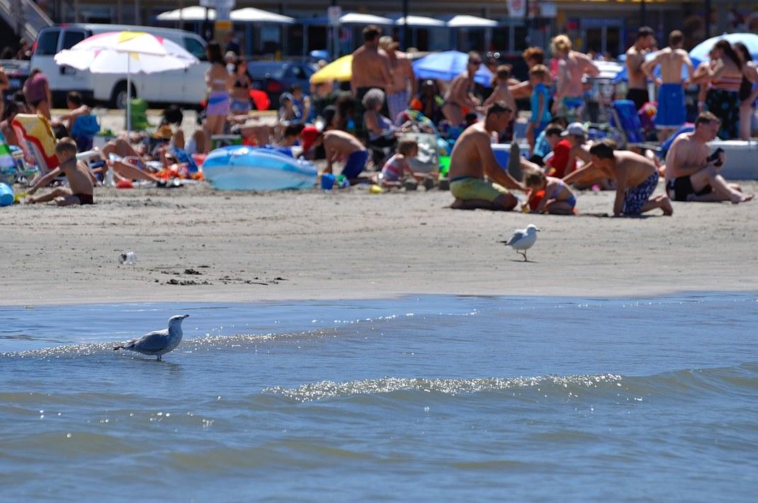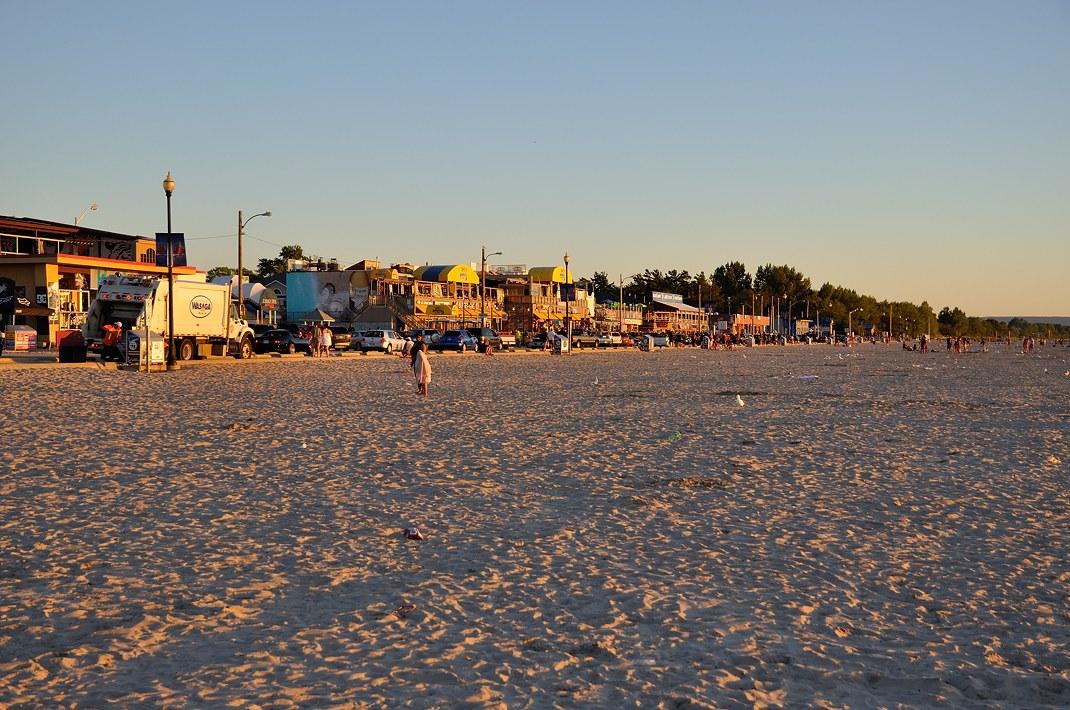 Вдоль пляжа идёт дорога, по которой едут машины и гуляют люди. Там же кафе, бары, магазины типа "Всё для пляжа" и передвижные аттракционы. Все едят, пьют пиво, у всех расслабленные лица и хорошее настроение.