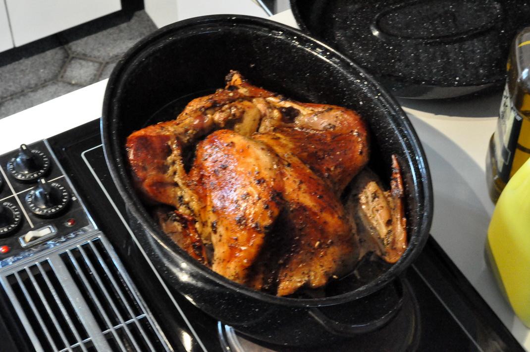 берём кастрюлю-индюшатницу за 11 долларов из волмарта. Индюшку (та, что без сухарей внутри) размораживаем, моем, намазываем смесью специй с майонезом. Можно делать и просто с чёрным перцем и чуть-чуть солью, но мы чаще всего используем смесь для гриля “Montreal Steak Spice” и соль не добавляем, мешаем смесь с майонезом.