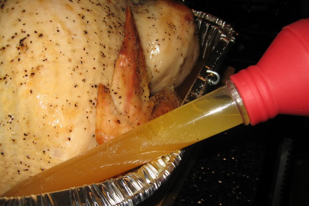 Самое главное – где-то через час или когда зарумянится, начинать тщательно поливать через каждые минут 15-20 образующимся соусом. Поливать проще всего вот такой кулинарной соской. Иногда индюк готовится и быстрее, чем за 3 часа. Нужно смотреть. В духовке - всё время в кастрюле с закрытой крышкой. Он гарантированно получается сочным и очень вкусным. Конечно, всегда немного по-разному. Но никогда не сухой.