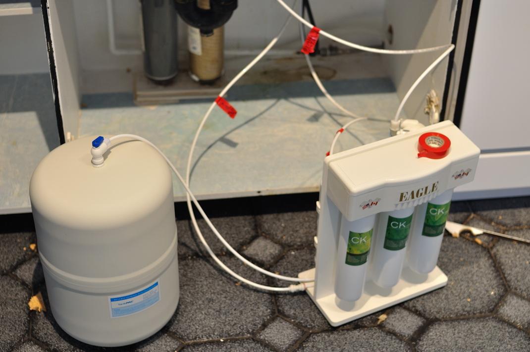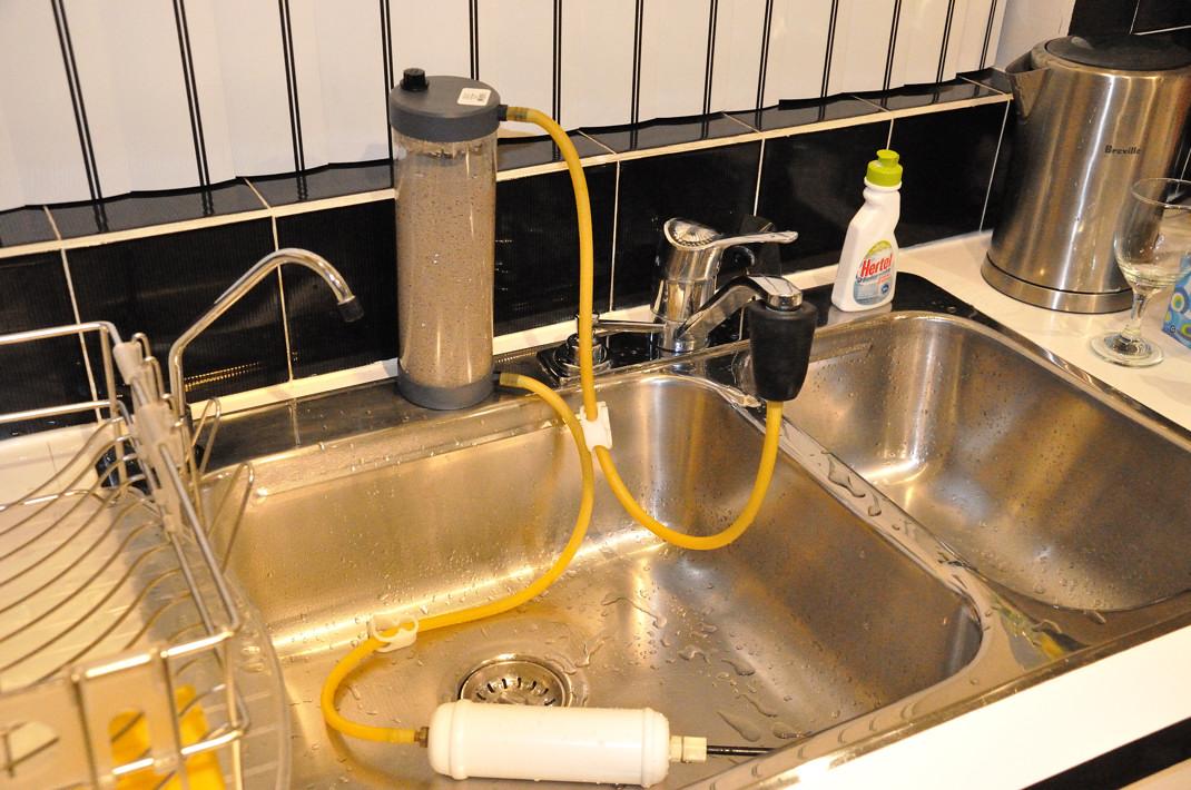 Осталось добавить четырёхступенчатую систему фильтров для питьевой воды и от неё дополнительный краник на мойку. Из этого краника вы будете пить вкуснейшую свежую воду и использовать её для приготовления пищи. Теперь вода из пластиковых бутылок покажется вам невкусной, пить вы её не сможете. На снимке - в момент смены кухонной мебели перед отсоединением фильтров.