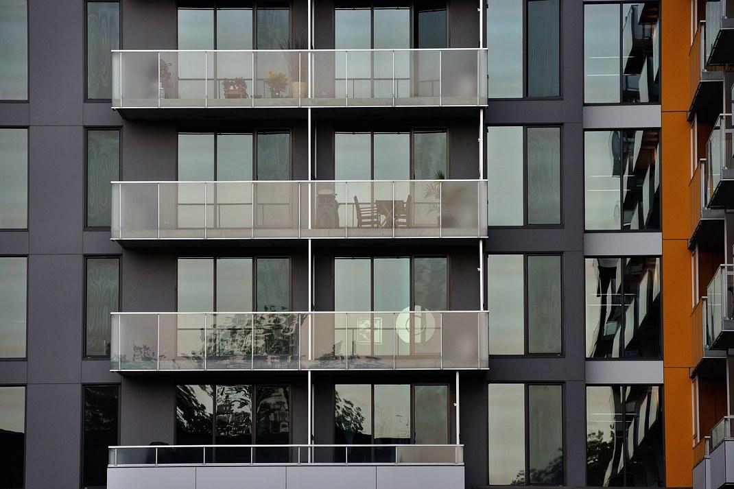 Новый красивый дом. На балконах у всех стоят компрессоры от сплит-систем. Их не видно за матовыми стёклами балконов
