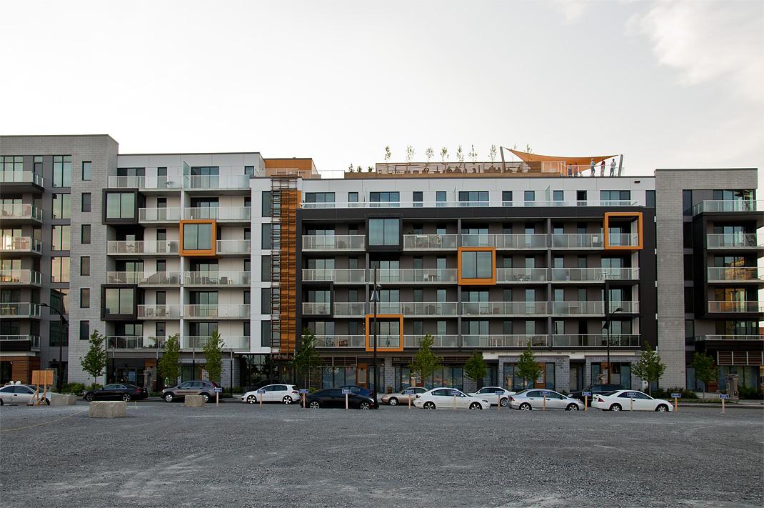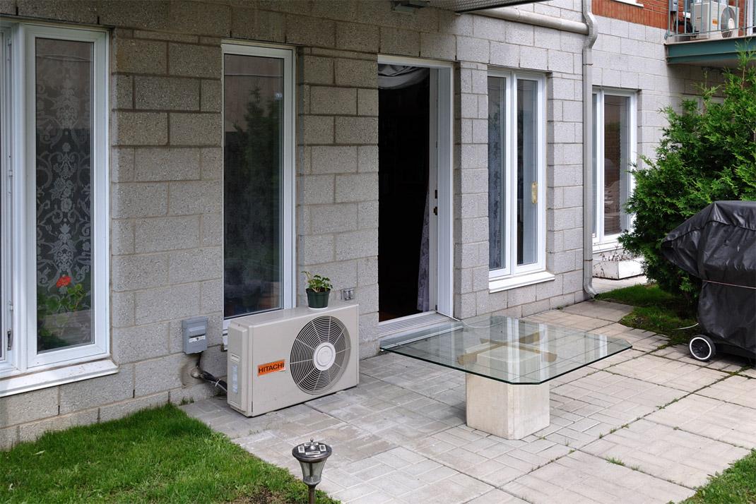 Компрессор от сплит-системы Mitsubishi стоит в углу на балконе, занимает место. Можно было бы подвесить, но тогда это повлияет на внешний вид дома. Это всё тот же красивый новый дом, что и на снимке выше. Проекты Zuni и Pavillon в Pointe-Nord на Île-des-Sœurs