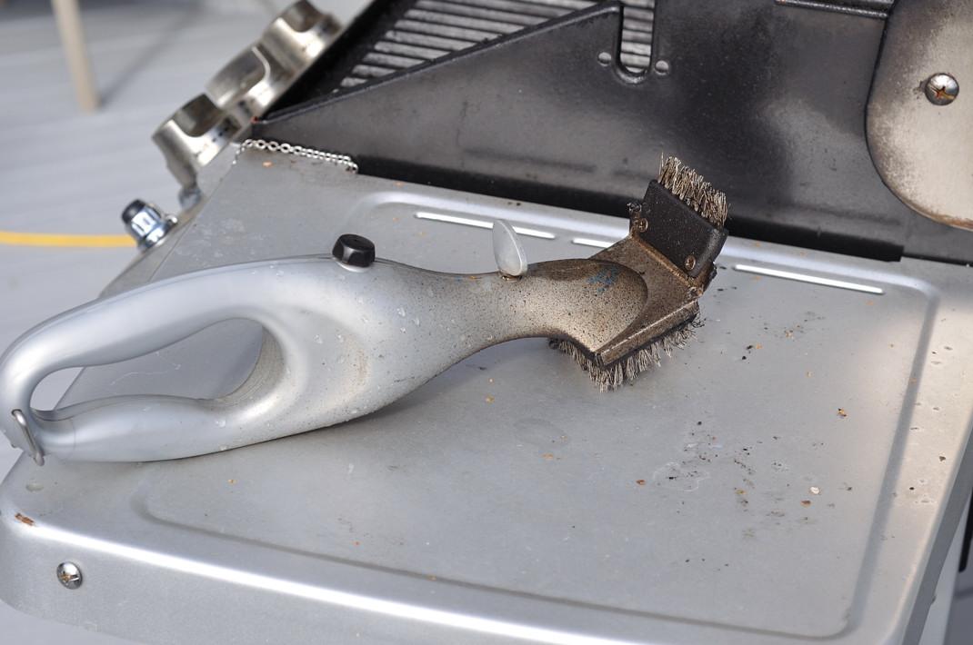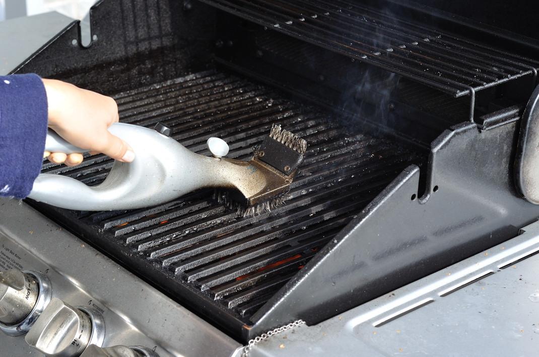 Чистить решётку лучше всего получается вот такой щёткой, в ручку которой наливается вода. Пока решётка горячая, смачиваемая водой, чистится очень хорошо, а главное – легко, быстро, качественно.