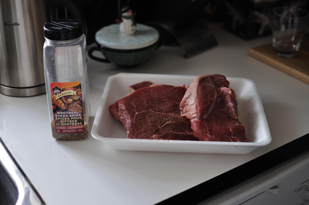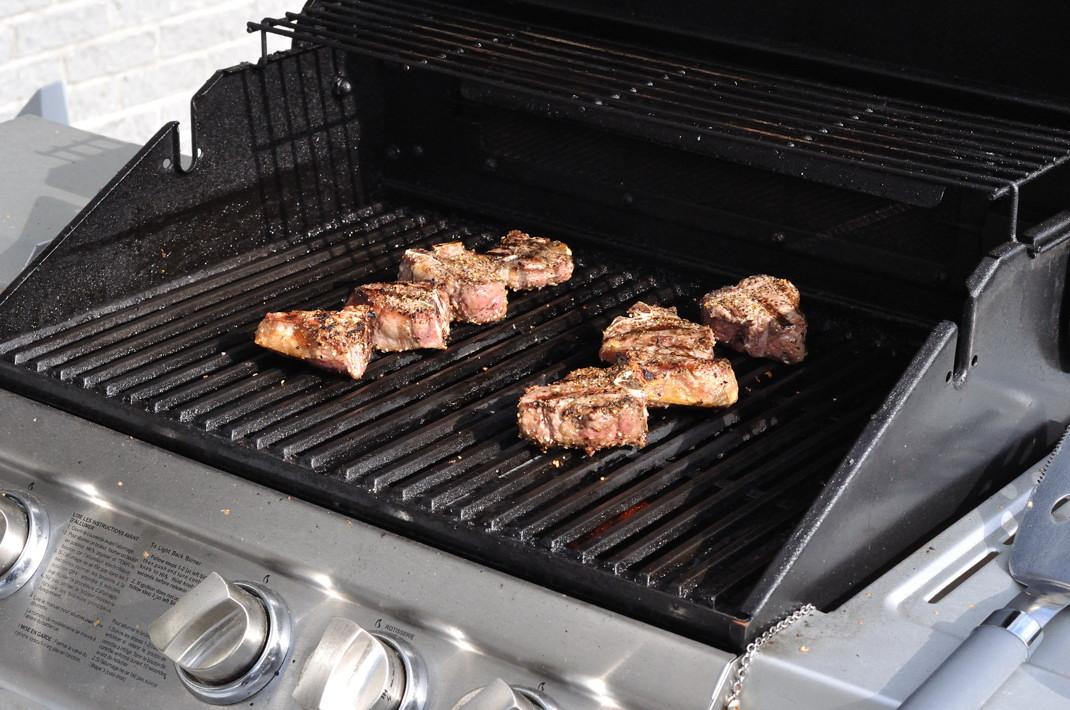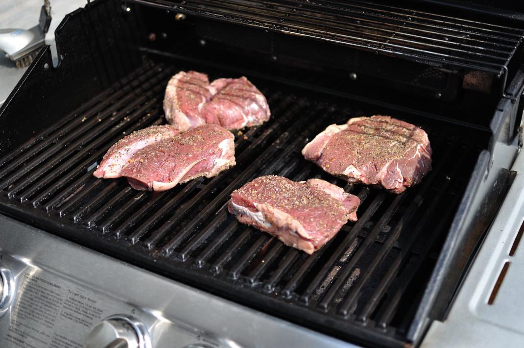 Если вы ни разу не готовили мясо на BBQ, предлагаю следующий рецепт: прогреваете несколько минут решётки, при закрытой крышке, разумеется. Если на крышке есть градусник, то его стрелка приблизится к пределу. Кладёте обработанное пряностями мясо, крышку закрываете. Жарите на очень медленном огне с закрытой крышкой 5 минут. Вот здесь момент коварный – у кого-то будет минутой больше, у кого-то меньше. Зависит вплоть до того, как и куда дует ветер. Нужно, чтобы прожарилось хотя бы вот так, как на снимке. Потом крышку открываете, переворачиваете мясо лопаткой, жарите ещё 5 минут другую сторону тоже при закрытой крышке. Мясо готово.