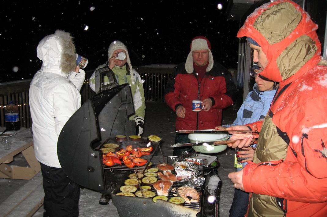 Жарить на BBQ можно даже и зимой. Ещё как вкусно! На снимке – встреча Нового года. В кружках – горячее вино. Идёт снег.